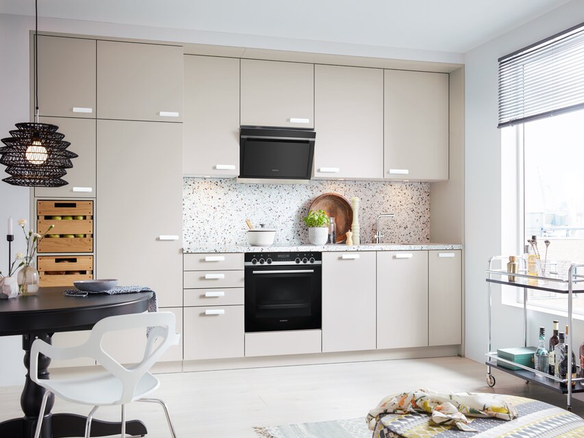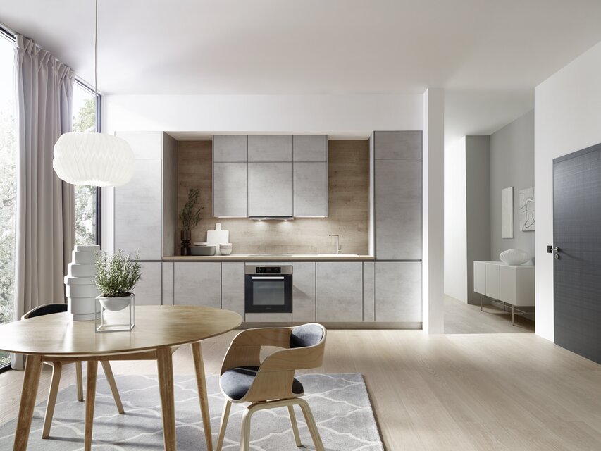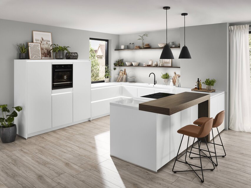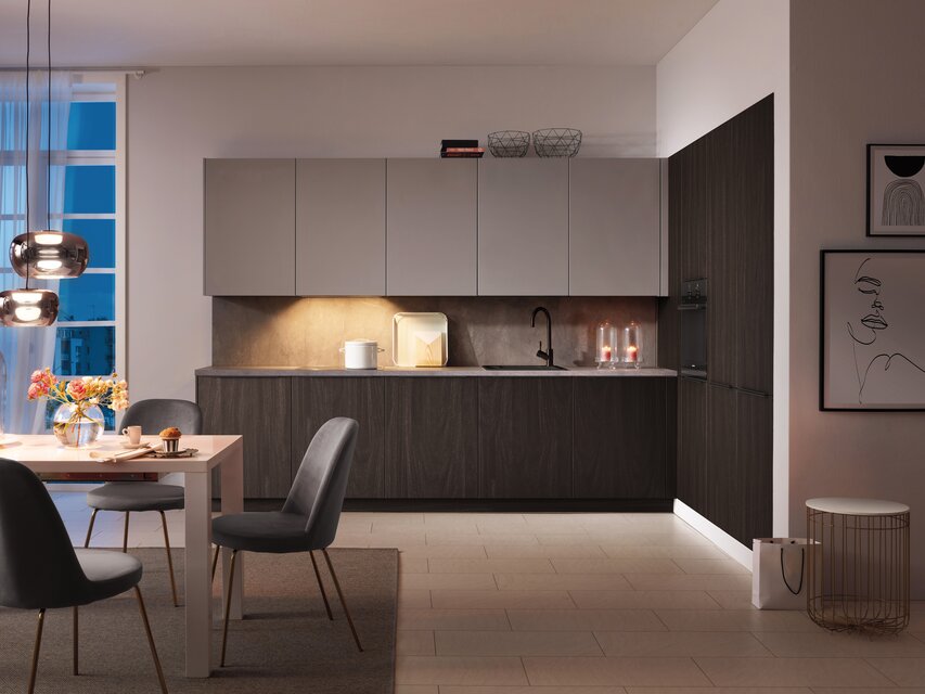 Die Einbauküche ist der Ort, an dem Kochen, Essen, Wohnen und die Zusammenkunft mit lieben Menschen miteinander verbunden werden. Um einen optisch nahtlosen Übergang zu anderen Bereichen des Zuhauses zu ermöglichen, bietet es sich an, das Konzept der anderen Räume bei der Gestaltung und Planung der Küche aufzugreifen. Durch das Einbeziehen des Wohnstils angrenzender Bereiche entsteht ein optisch ansprechendes harmonisches Gesamtbild. Realisieren lässt sich dies unter anderem durch die Wahl der Dekore der Fronten und der Materialkombinationen, die in der Küche eingesetzt werden. Aktuelle Trends und pfiffige Ideen verwandeln die Küche in ein Ensemble, das sich zu einem perfekten Ganzen fügt. Das erzeugt eine wohnliche Atmosphäre, in der man sich einfach wohlfühlt. Aus der Kombination ausgeklügelter Elektrogeräte mit stilvollem Design lassen sich Traumküchen von außerordentlicher Eleganz konzipieren, bei denen man mit zahlreichen zusätzlichen Funktionen verwöhnt wird.